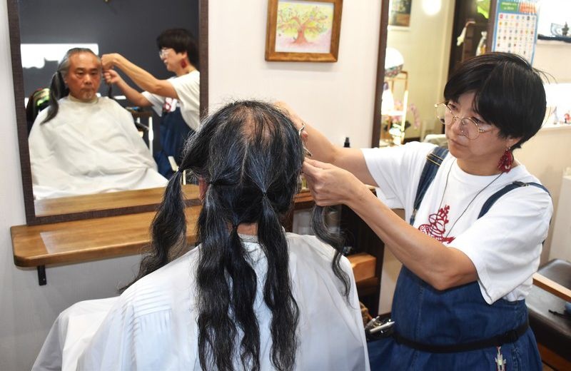 https://mutsushimpo.com/news/eq0i4kmx/長く伸びた小山内さん(左)の髪をカットする徳田さん