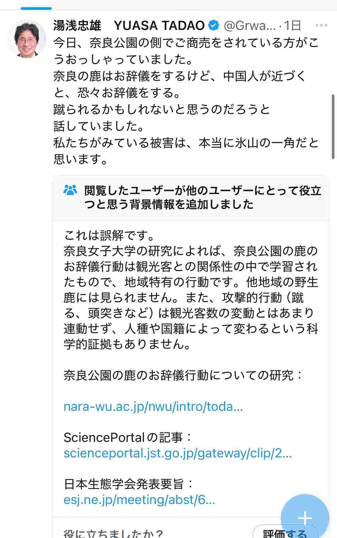 愛国者「奈良公園で商売してる人が鹿さんは中国人には戦々恐々お辞儀する。蹴られてるからだと話していた」