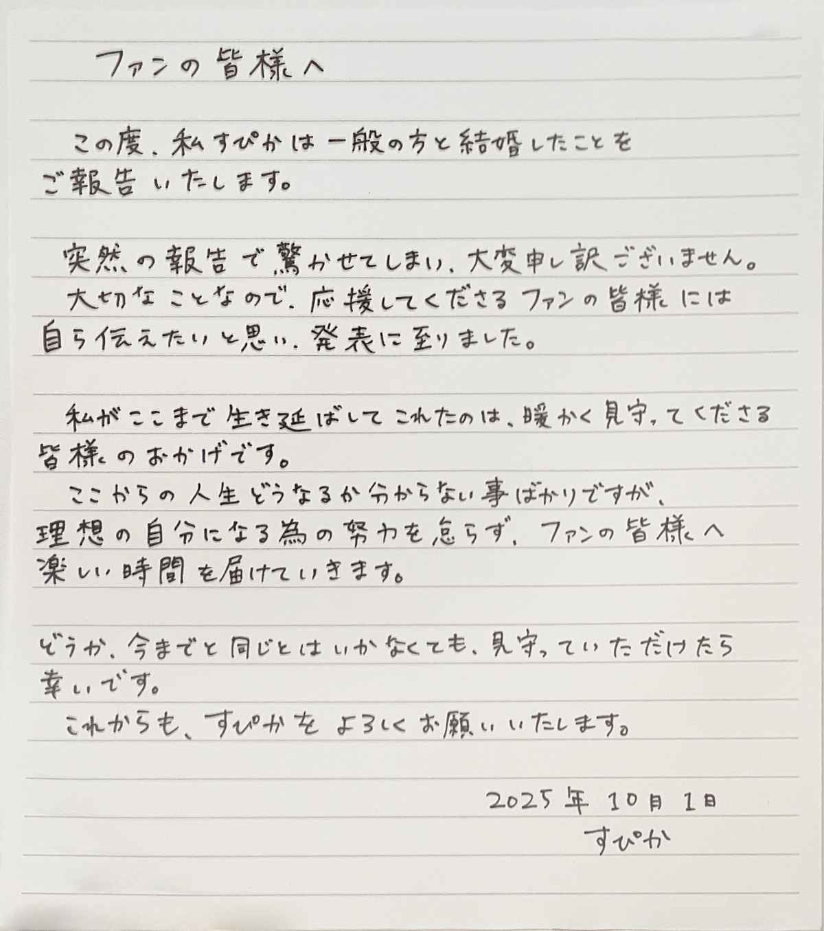 すぴかさんは、2025年10月1日に一般の方と結婚したことをファンに報告しています。