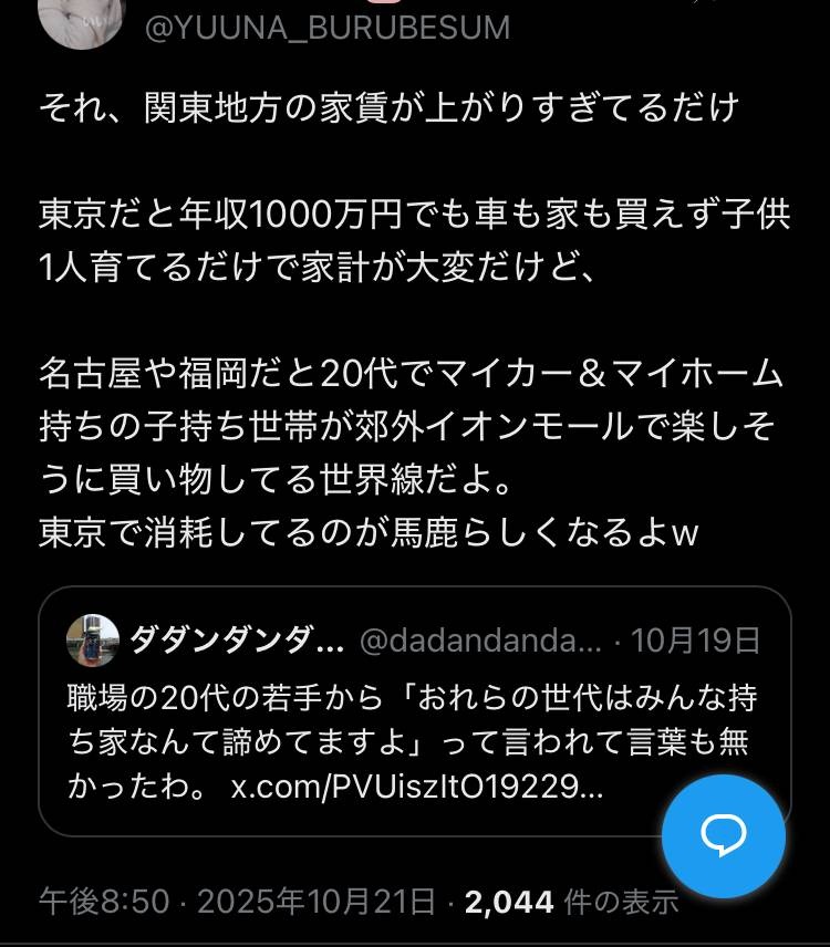 名古屋や福岡だと20代でマイカー&マイホーム持ちの子持ち世帯が郊外イオンモールで楽しそうに買い物してる世界線だよ。