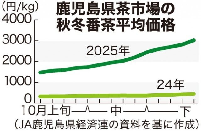 全国の秋冬番茶が異例の高値相場を記録している。主要産地の鹿児島県茶市場では、1キロ平均価格が3000円を突破。昨年同時期と比べると約7倍の水準で、今年の一番茶価格も上回った。海外需要が急拡大している…