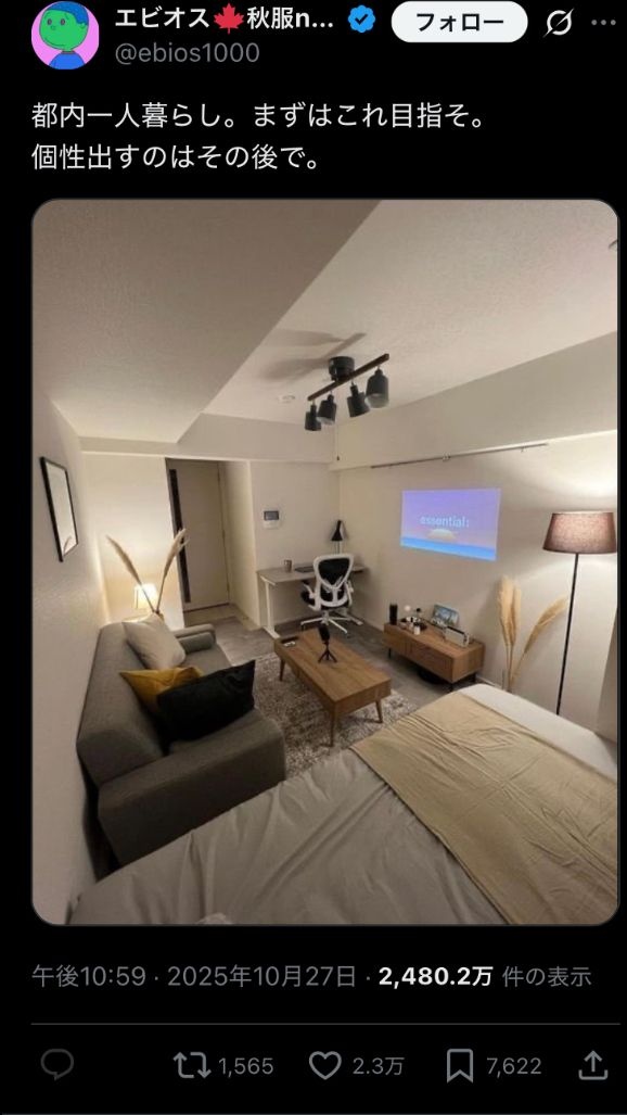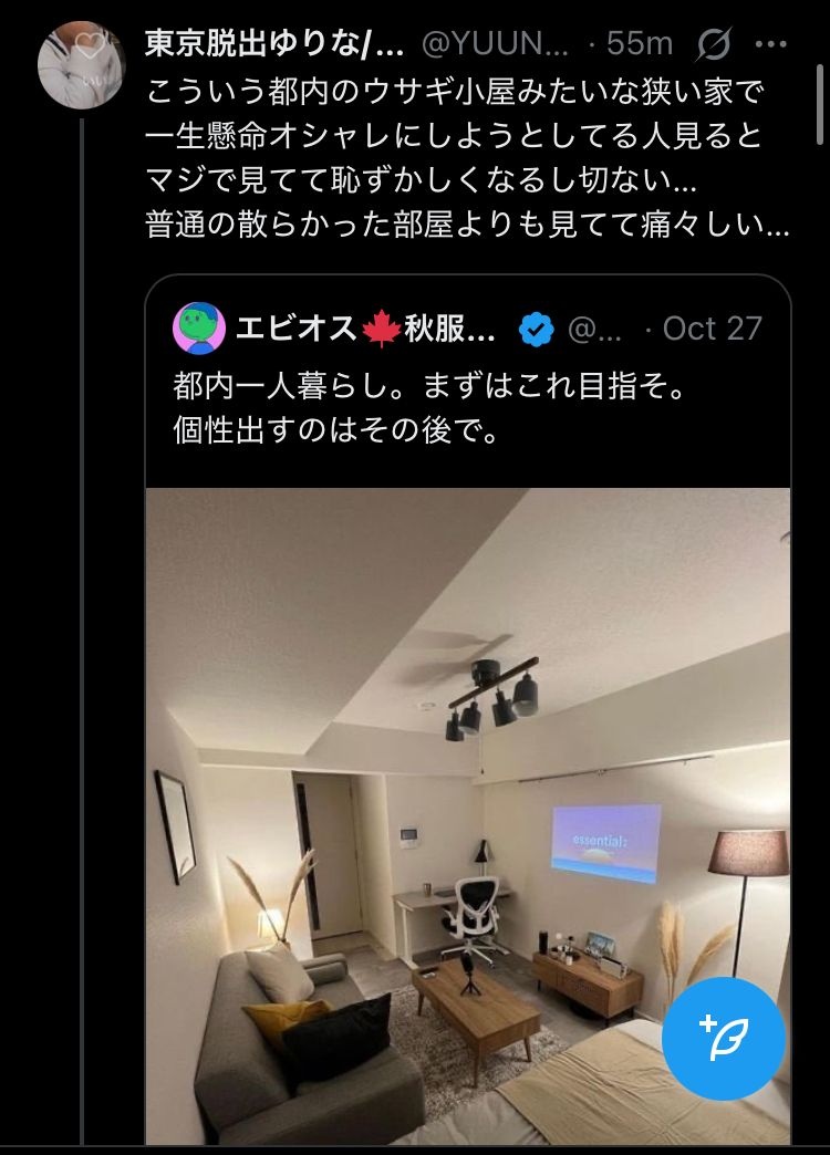 こういう都内のウサギ小屋みたいな狭い家で一生懸命オシャレにしようとしてる人見るとマジで見てて恥ずかしくなるし切ない…