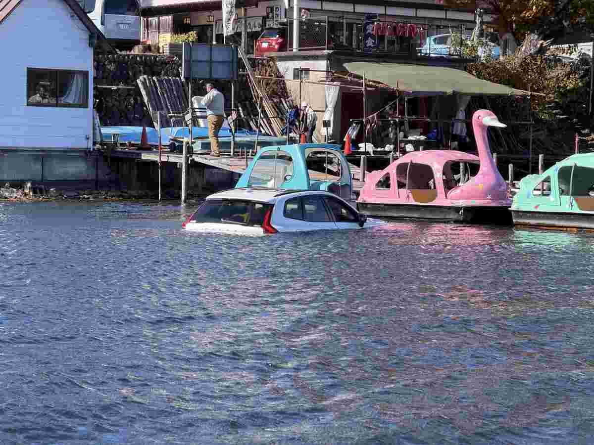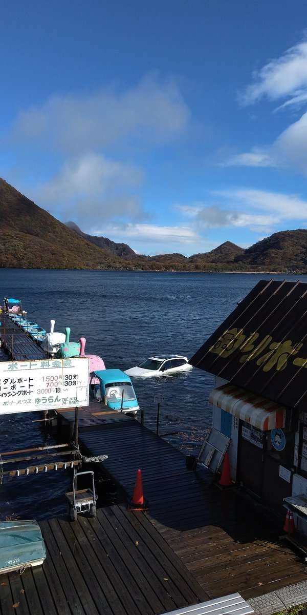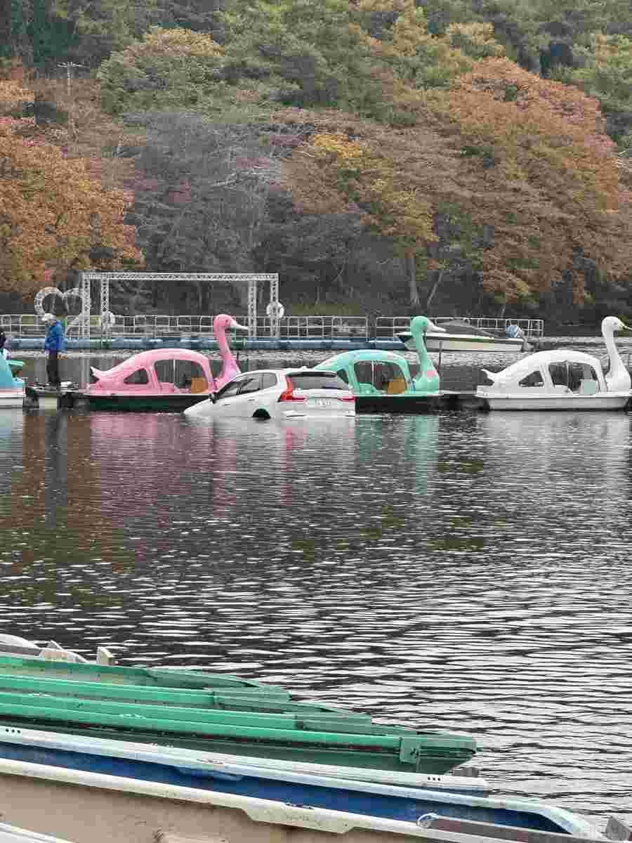少し雨が降ってたので雷かなと思ったら、なんと駐車場から湖に車が落ちてるではないか‼︎