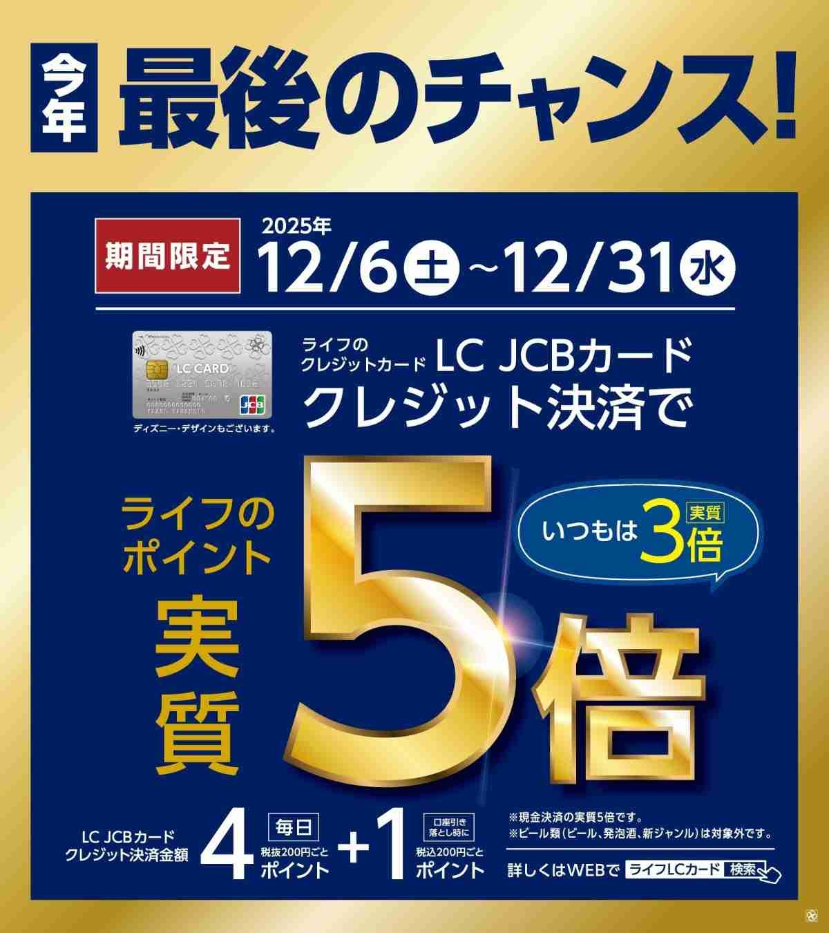 「LC JCBカード」がいつもよりもっとお得になる今年最後のチャンス! 大好評のライフのポイント「実質5倍」キャンペーンを12月6日(土)から31日(水)まで開催 | 株式会社ライフコーポレーション
