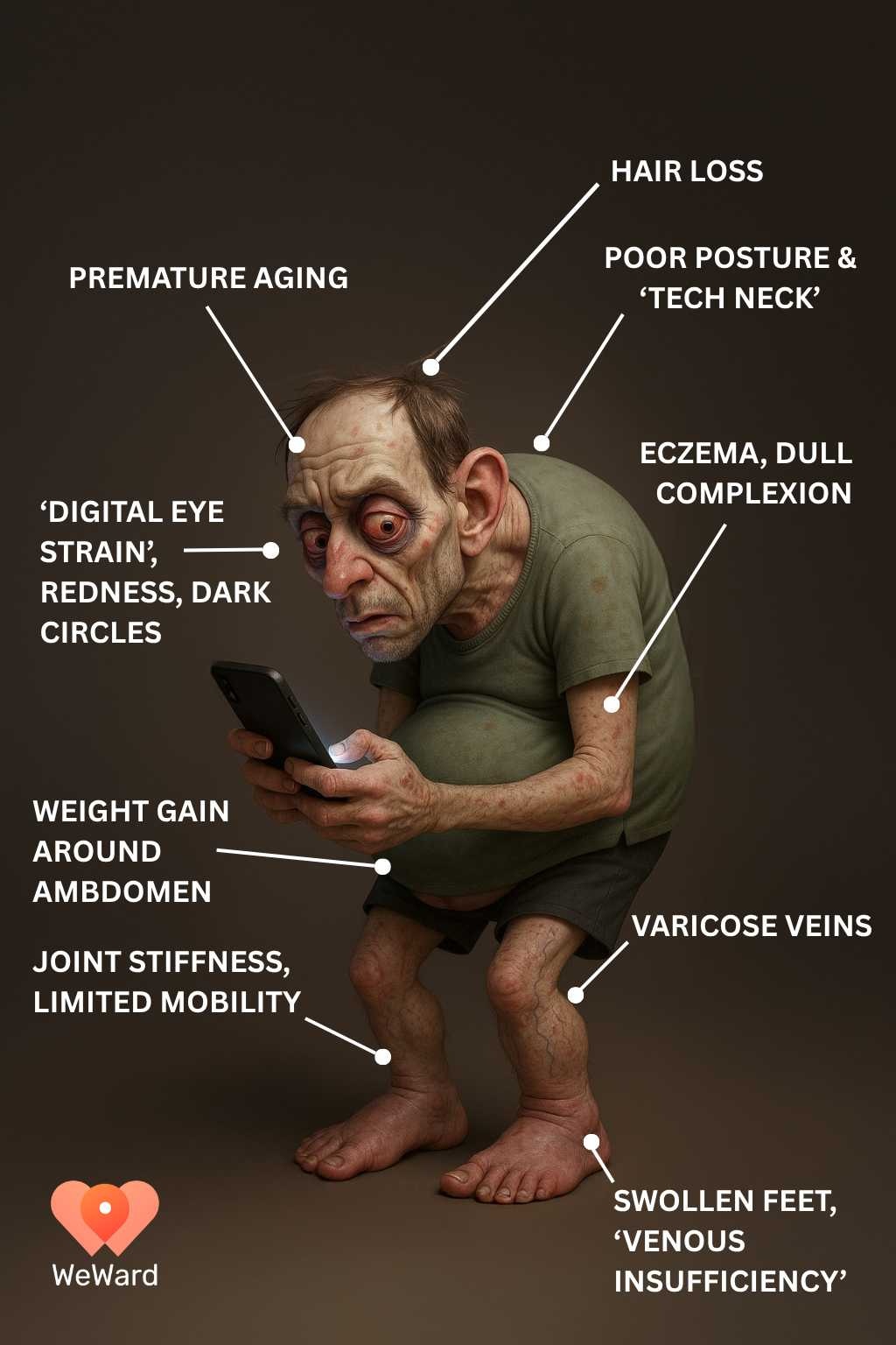公開されたサムの姿は、長時間の座式生活で消費カロリーが少なく、新陳代謝が低下して腹に脂肪が蓄積し、腹部肥満になっている。長時間、前かがみの姿勢でスマートフォンを使ってきたため、背中は丸まり、頭部が前方に傾き、いわゆる“猫背”の状態だ。目は充血している。