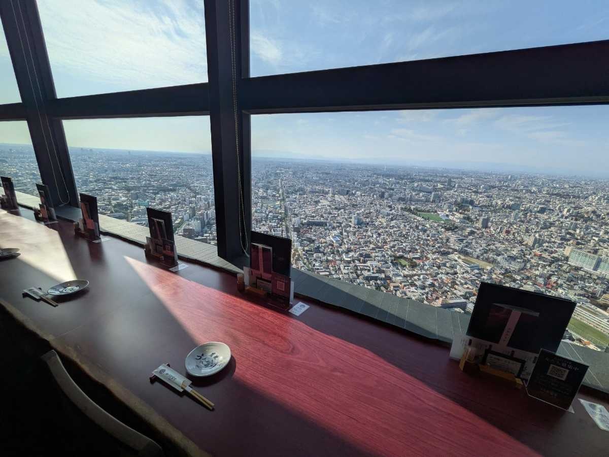 この店舗は、地上約230メートルに位置するため「日本一高い場所にある鰻屋」となります。窓の外には東京の摩天楼が広がり、遥かかなたには丹沢の山々、そしてその奥に雄大な富士山の姿を望むことができます。
