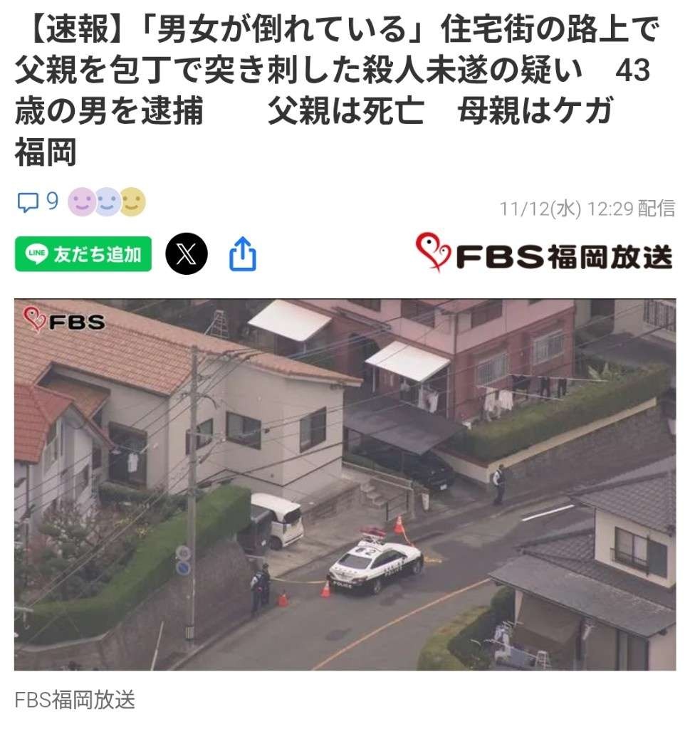 【速報】「男女が倒れている」住宅街の路上で父親を包丁で突き刺した殺人未遂の疑い 43歳の男を逮捕 父親は死亡 母親はケガ 福岡(FBS福岡放送) - Yahoo!ニュース12日午前、福岡県那珂川市の路上で、父親の腹部付近を殺意を持って包丁で突き刺し、意識不明となるケガをさせたとして、殺人未遂の疑いで43歳の男が現行犯逮捕されました。父親は午前11時半ごろ、死亡が確認news.yahoo.co.jp
