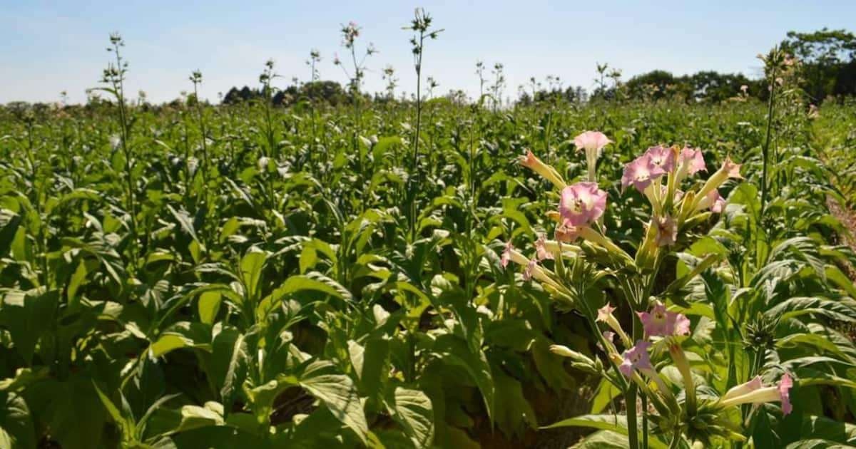 6月上旬、岡山県久米南(くめなん)町の山間地帯に広がる葉タバコ畑を訪ねた。6反(約6千平方メートル)の土地では、1万1千本以上の苗が人の背丈ほどに成長していた。観葉植物のような大きな葉をつけ、よく晴れた空に向かってピンク色の花を咲かせていた。