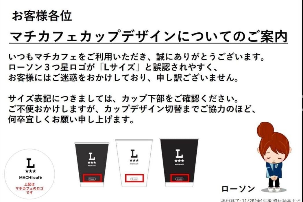 ロゴの「L」がサイズ表記と紛らわしいと指摘を受けたコーヒーカップについて、コンビニ大手「ローソン」は2025年11月18日、デザインを変更すると明らかにした。
