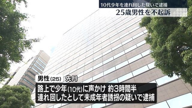 先月、新宿区の路上で10代の少年に声をかけ、およそ3時間半連れ回したとして、未成年者誘拐の疑いで逮捕された25歳の男性について、東京地検は18日付で不起訴処分としました。