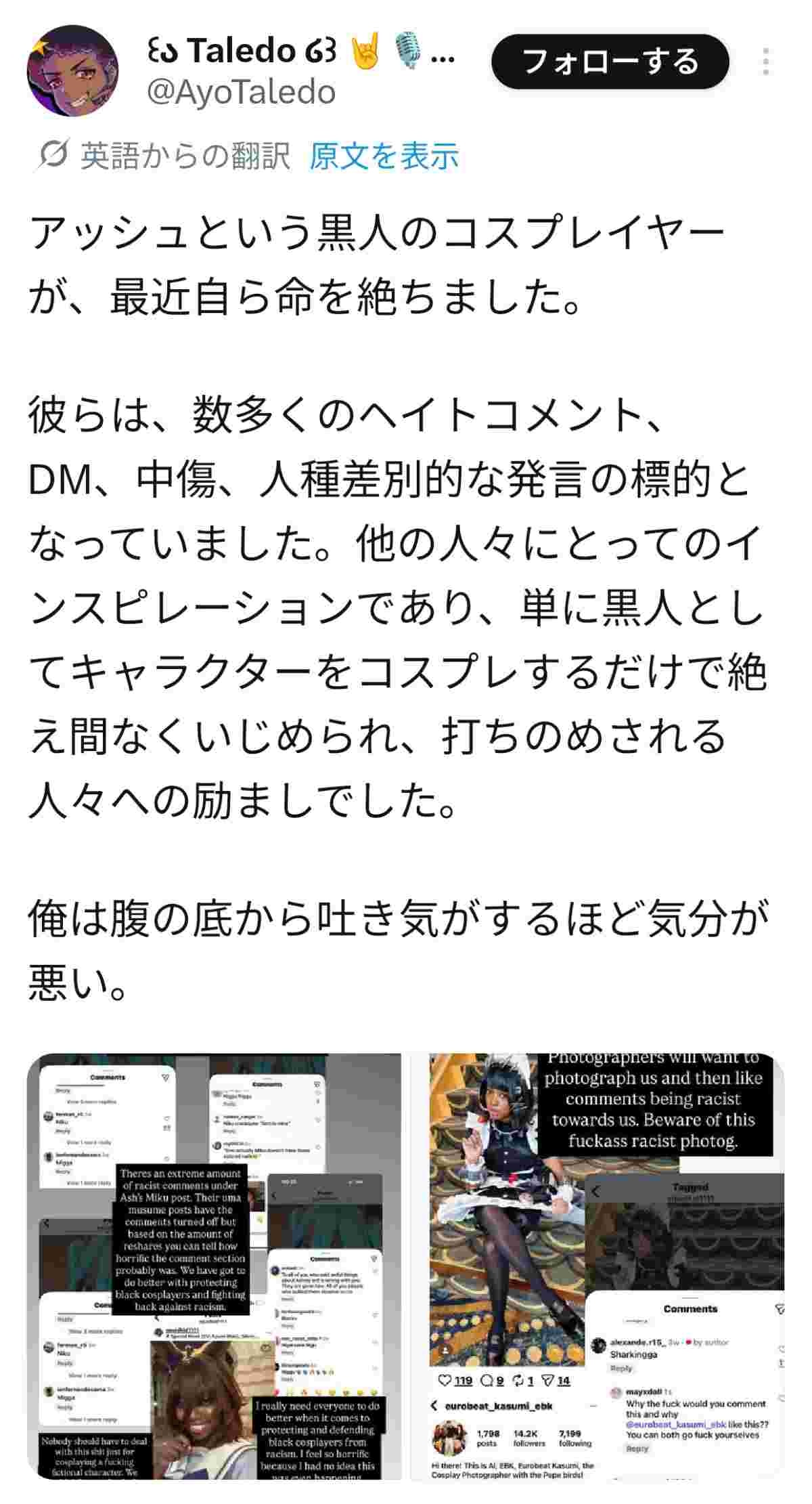 黒人キャラのコスプレを白人がするとこんなの比じゃないくらい攻撃してたんだから自業自得なとこあるわ