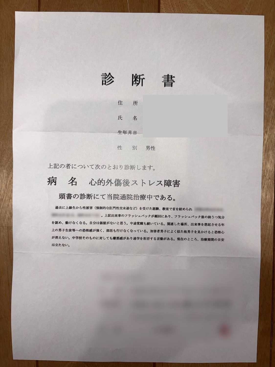 別の日には、公園内にある女子トイレにサトルくんを連れ込み、ズボンを脱がせると「お尻の穴にチンチン入れさせて」と言い、自身の性器を挿入しようとした。サトルくんはその後PTSD(外傷後ストレス障害)の診断を受けるほど精神を病み、生活は一変してしまった。