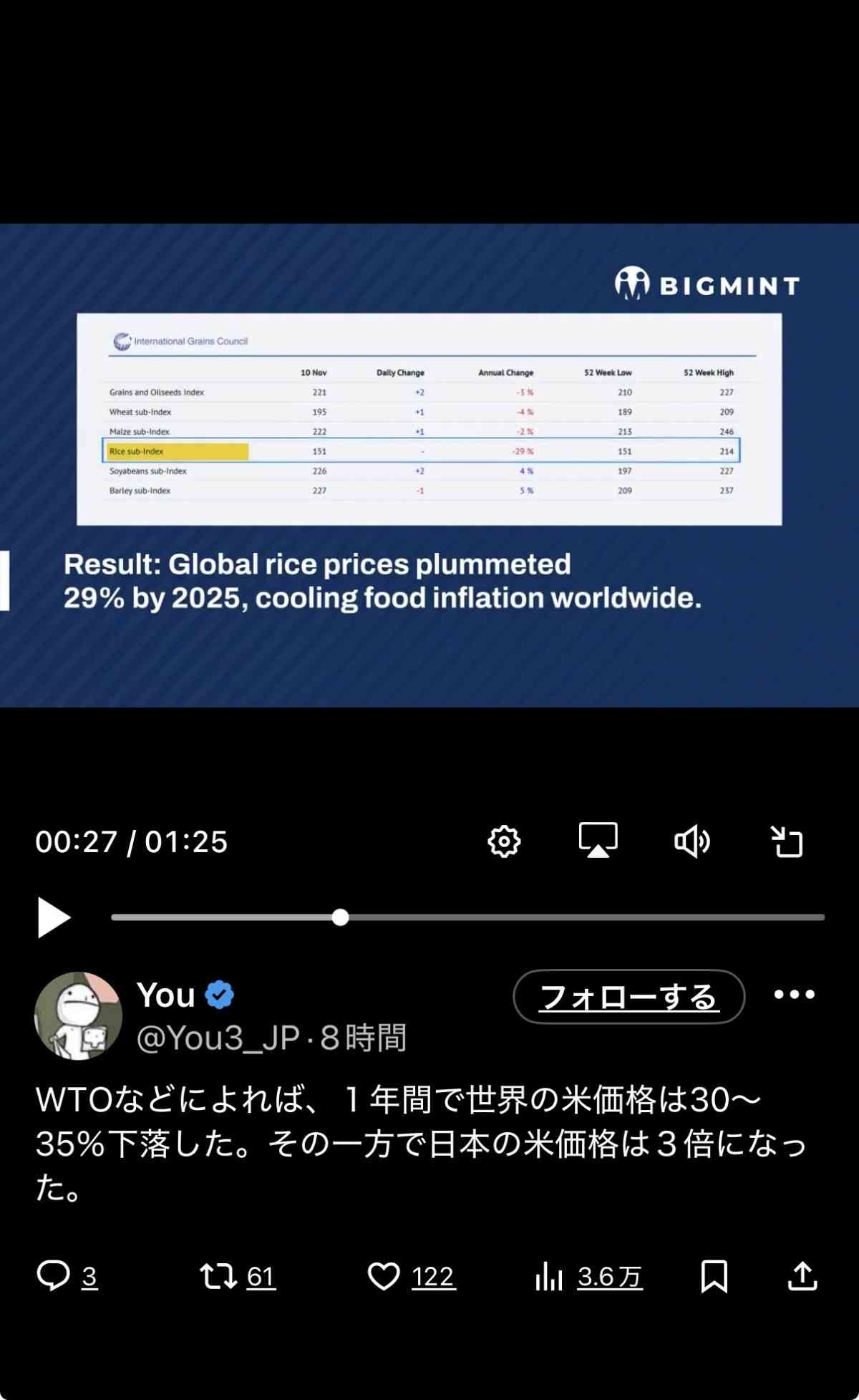 WTOなどによれば、1年間で世界の米価格は30~35%下落した。その一方で日本の米価格は3倍になった。