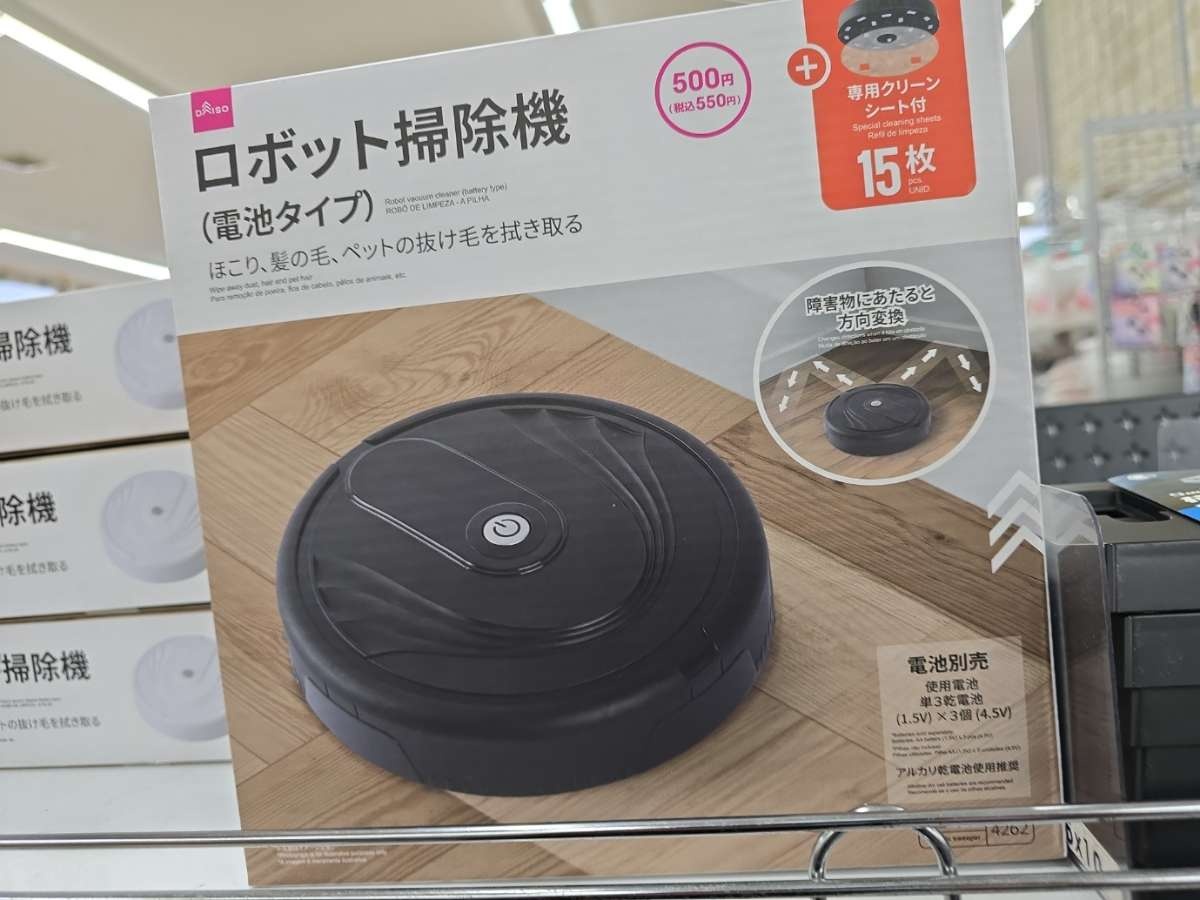 ダイソーにロボット掃除機が売ってて、それが500円で、単三電池3本で動いて、吸引せずにウロウロ拭くだけ、という全ての要素に驚いてる@