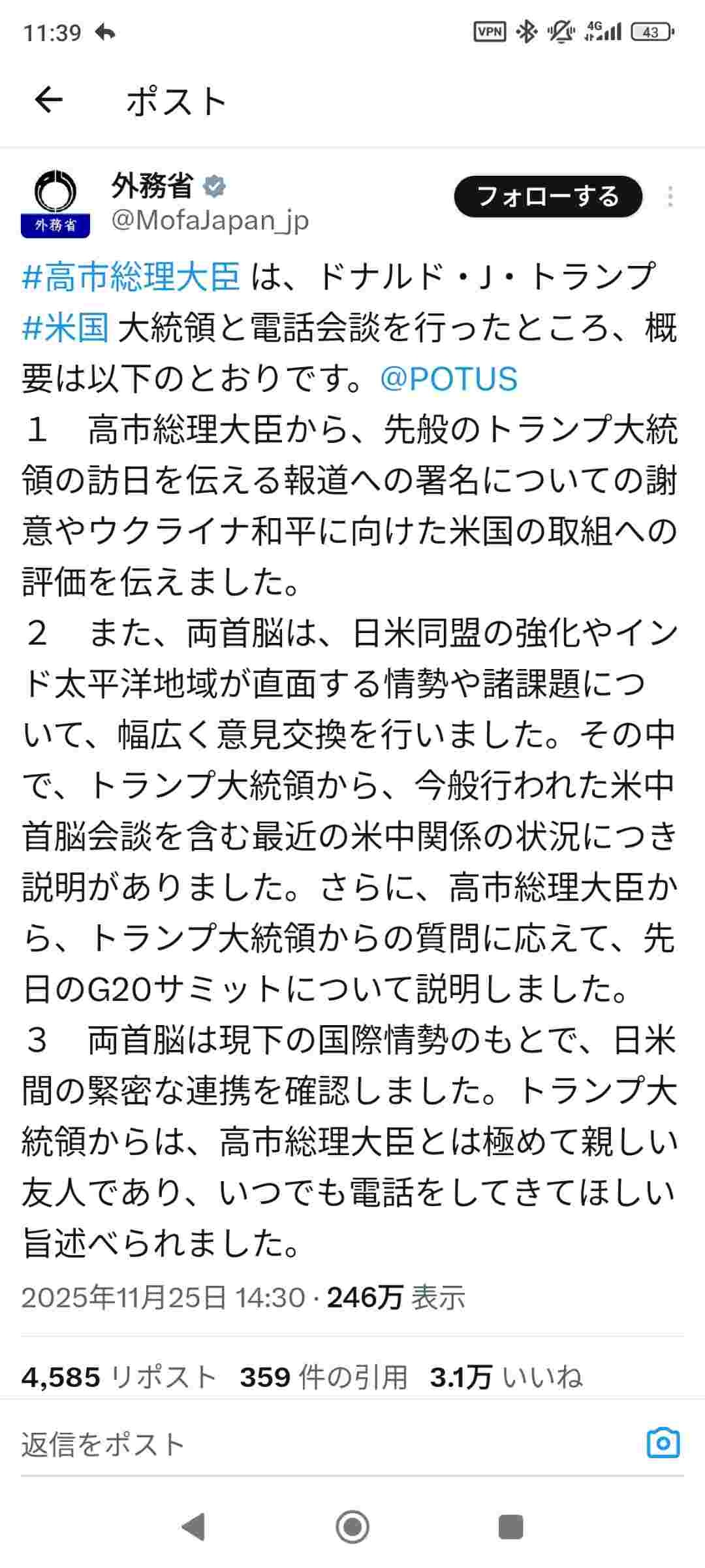 2日前の外務省「トランプとの対談はこんな事を話し合ったよ❤」←台湾問題への言及なし