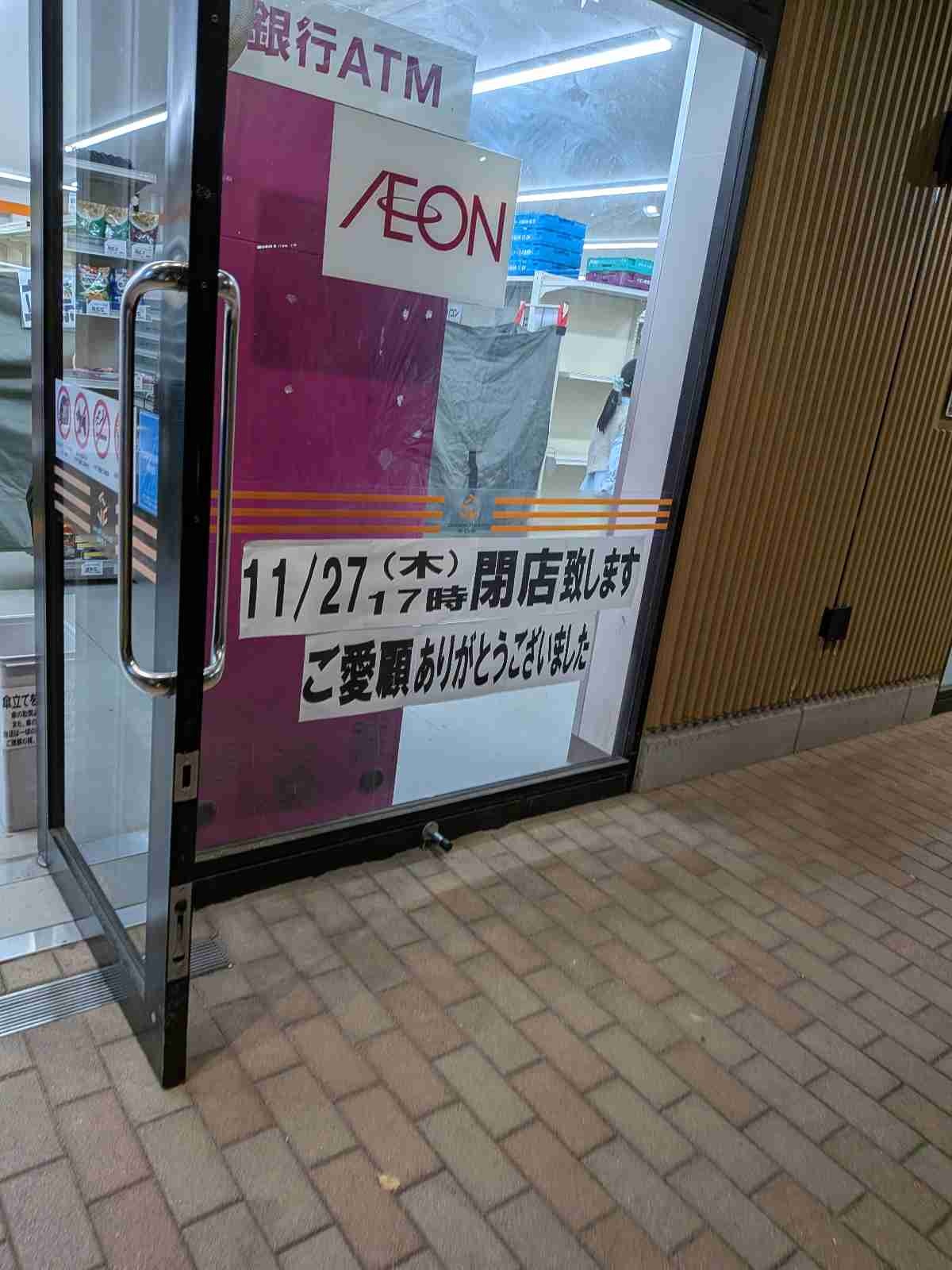 店頭のガラス面には大きく「11/27(木)17時 閉店致します。ご愛顧ありがとうございました」と掲示されており、長らく地域の生活を支えてきた店舗が営業を終えることが正式に案内されています。