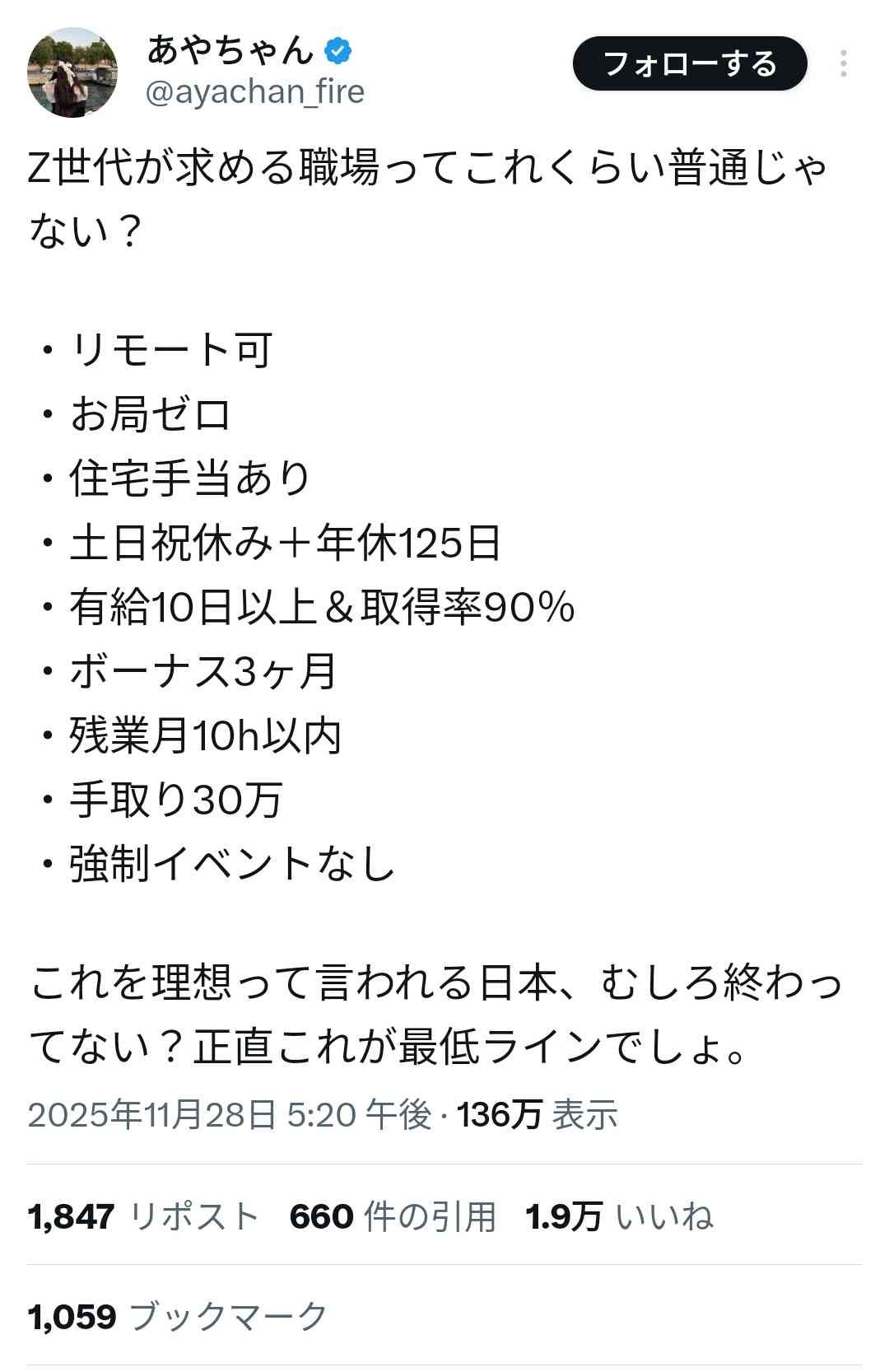 Z世代「あのさ、手取り月30万・リモート可・年休125・残業10h未満。これが最低ラインだよ?」