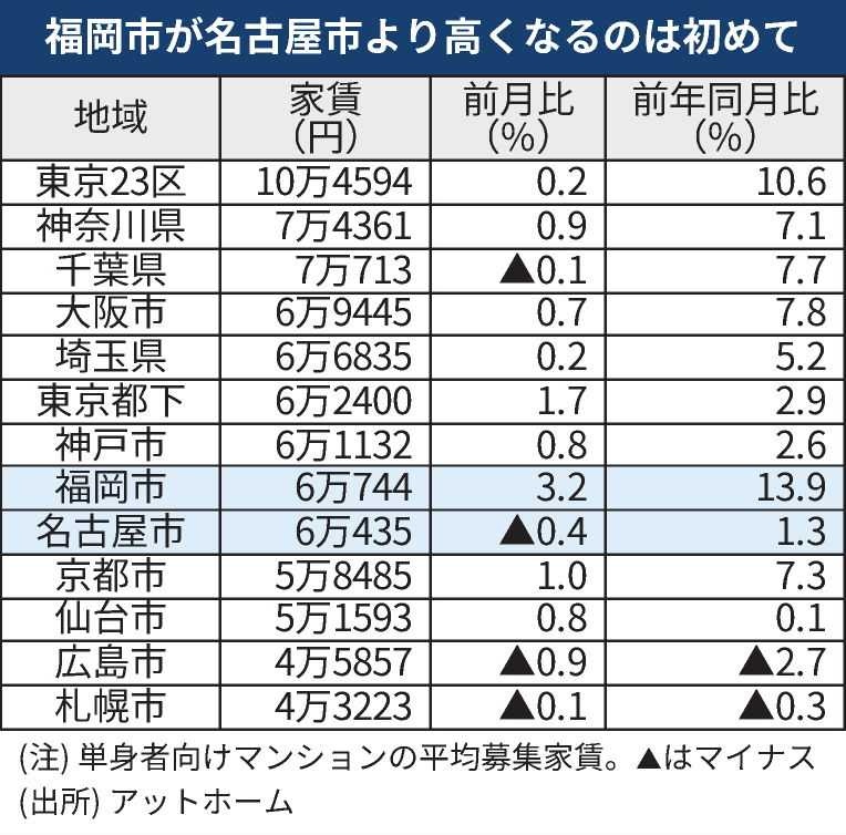 平均家賃、最高値更新 福岡が初の名古屋超え