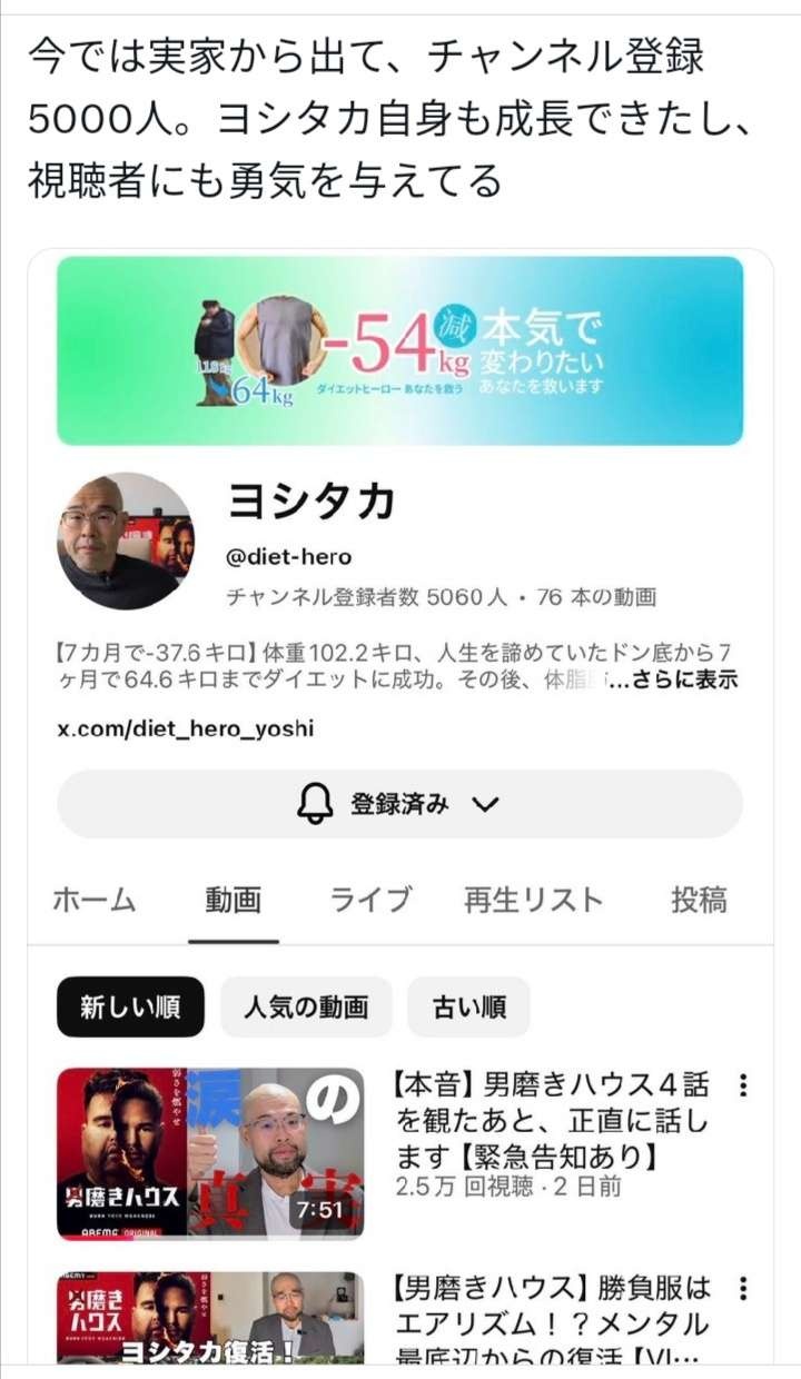 男磨きハウスで最新話まで見ましたが、ヨシタカさんのファンとして応援しております!