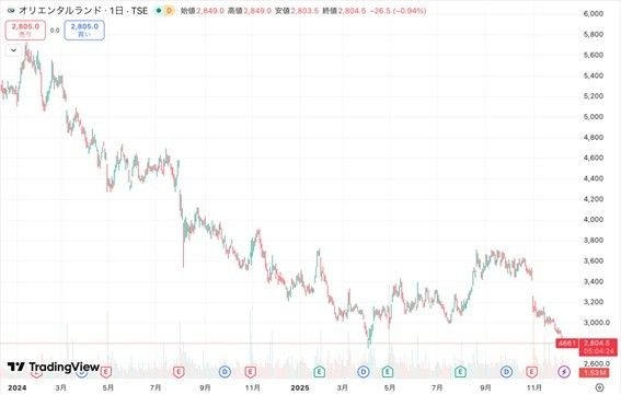 2024年6月に開業した大型新エリア「ファンタジースプリングス」という最大の好材料を消化した今、株価はその高値から半値程度まで大きく売り込まれている。