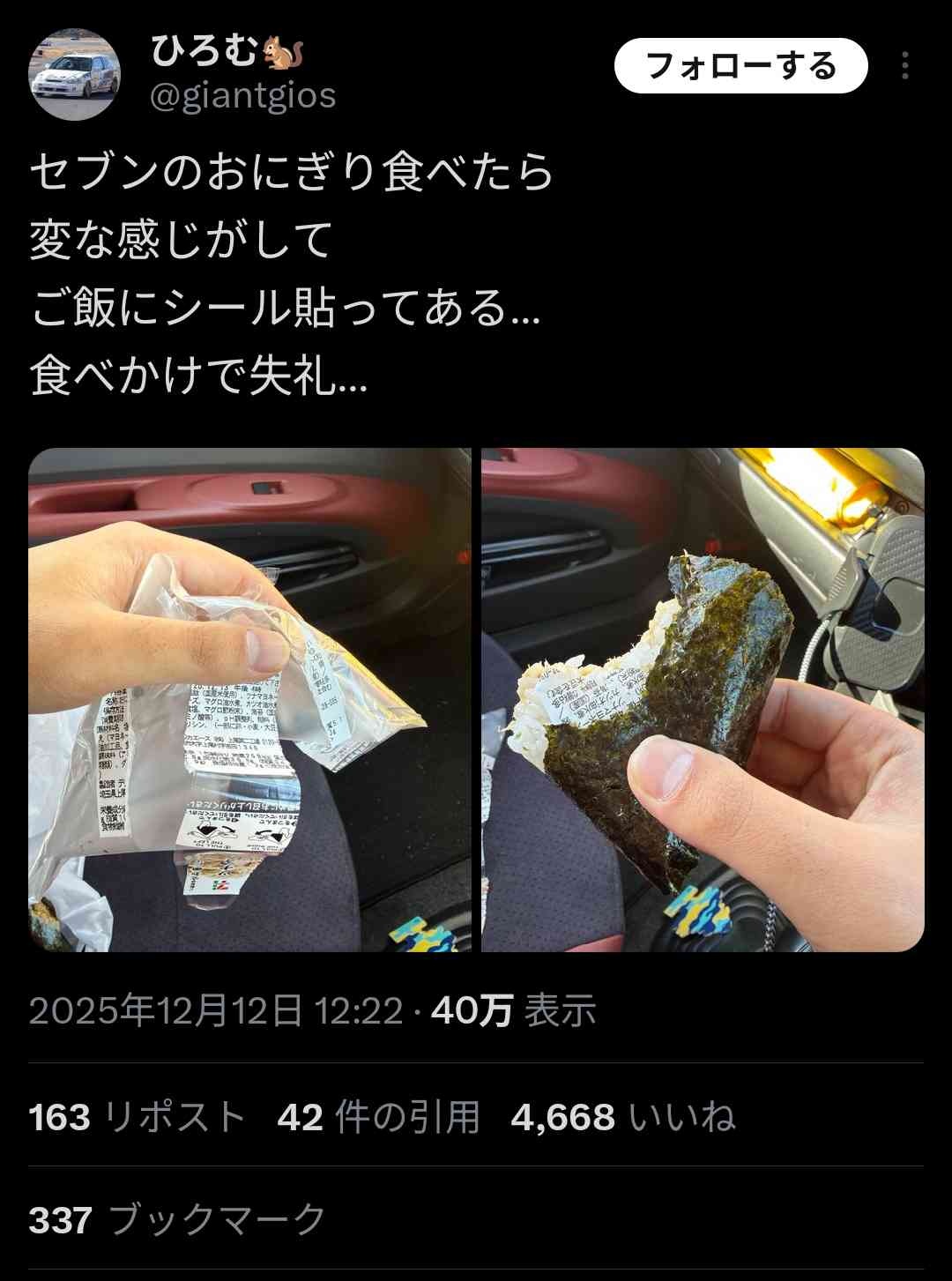 セブンイレブン、おにぎりの海苔の中に成分表シールを貼り客に食わせて終わるwww