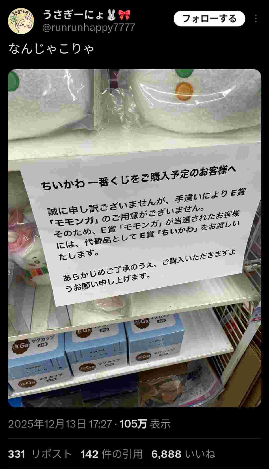 間違って渡された奴は折角ちいかわ当たったのにモモンガ渡されてブチギレだろ