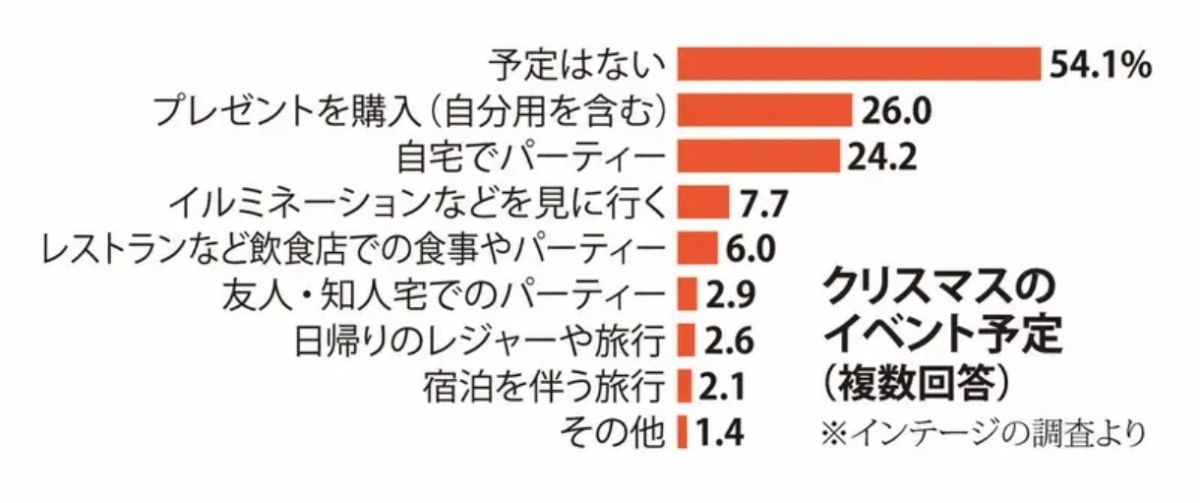 贈り物やパーティー、外出などのイベントについて「予定はない」との回答が54・1%で前年から3・0ポイント伸び、過去最高水準になった。その他は、プレゼントを購入(自分用を含む)26・0%▽自宅でパーティー24・2%▽イルミネーションなどを見に行く7・7%▽レストランなど飲食店での食事やパーティー6・0%――などだった。