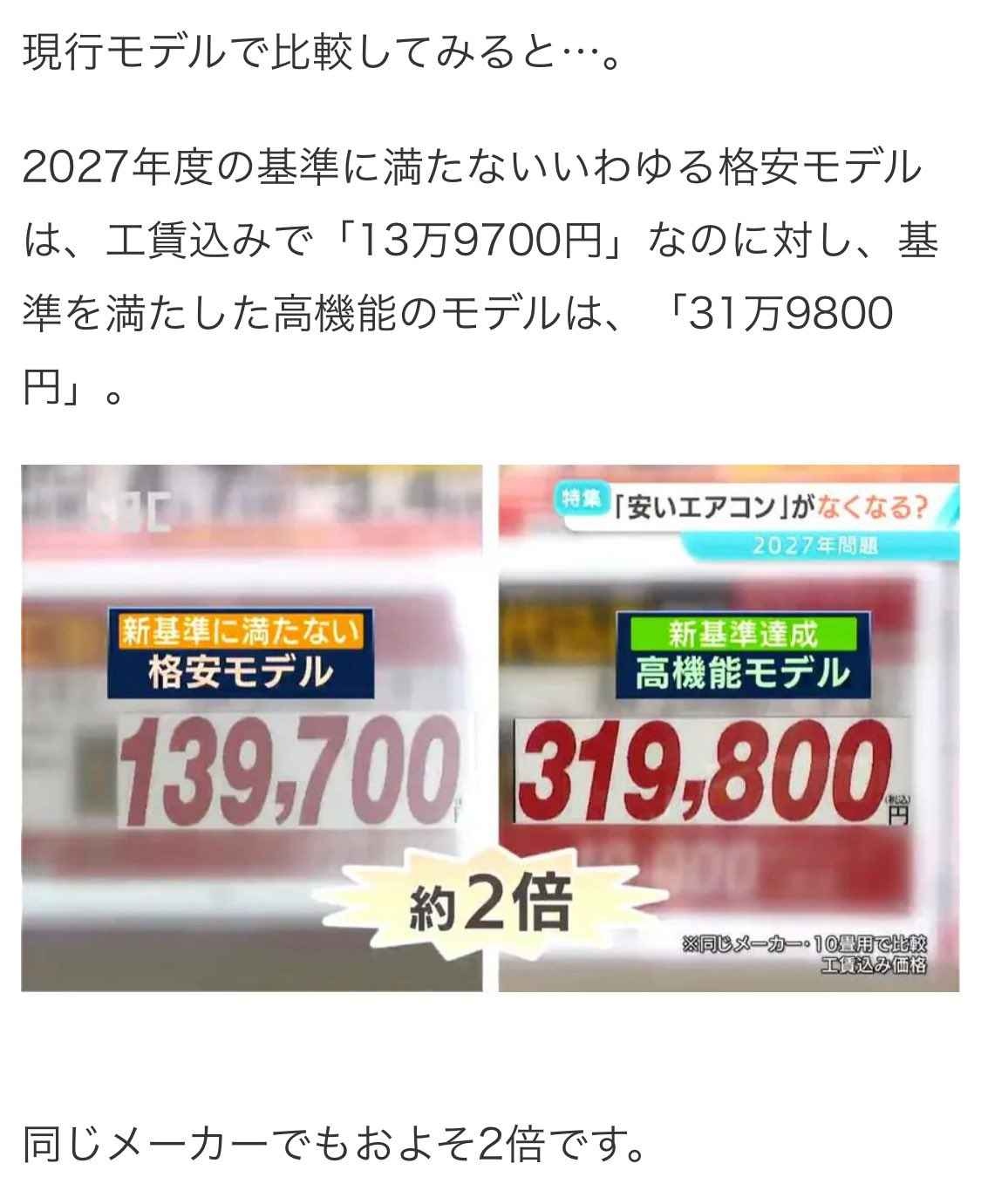 「メーカーさんの努力の末、なるべく安く高性能なものが未来として出てくる可能性は否定出来ない、ただ現状は発表がないのでわからない状況。徐々に値段が格安なものからなくなっていって、その後継機種がなくなるという流れはほぼほぼ明白かと思う。特に2階の子ども部屋、お盆だけ使う仏間など、『とりあえず冷房が効けばいい』という選び方の部屋、そこは本当に急いだほうがいい」