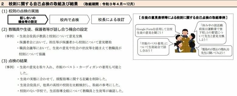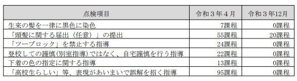 各学校で生徒会役員と教員が意見を交わす、保護者会で保護者から聞き取りをする、などをした結果、196課程が該当する校則を2022年4月から廃止することを決めた。