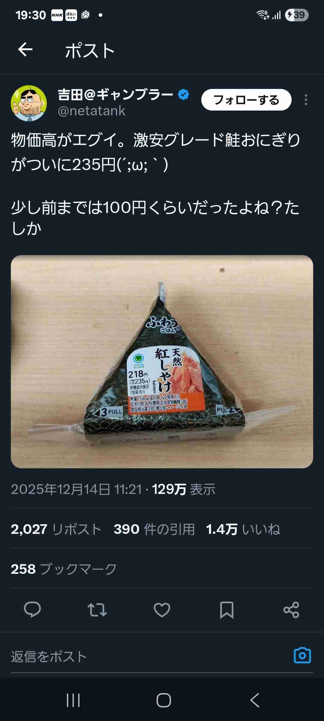 黒い丸いでかおにぎり半額だからって買ったら元値が300円近くてうーんてなる