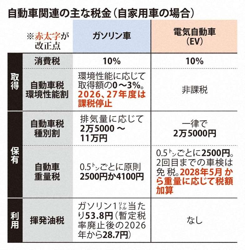2025/12/16 21:13 「車体重く道路傷める」EV上乗せ課税へ 脱炭素社会の実現どうなる | 毎日新聞週内にもまとまる2026年度与党税制改正大綱で、電気自動車(EV)を対象に、車体の重さに応じた自動車重量税の特例加算を28年5月に実施する方針が示された。ガソリン車など購入時に燃費性能に応じて課される自動車税の「環境性能割」も2年間停止となる見通しだ。これまで優遇されていたEVへの課税は強化されるmainichi.jp
