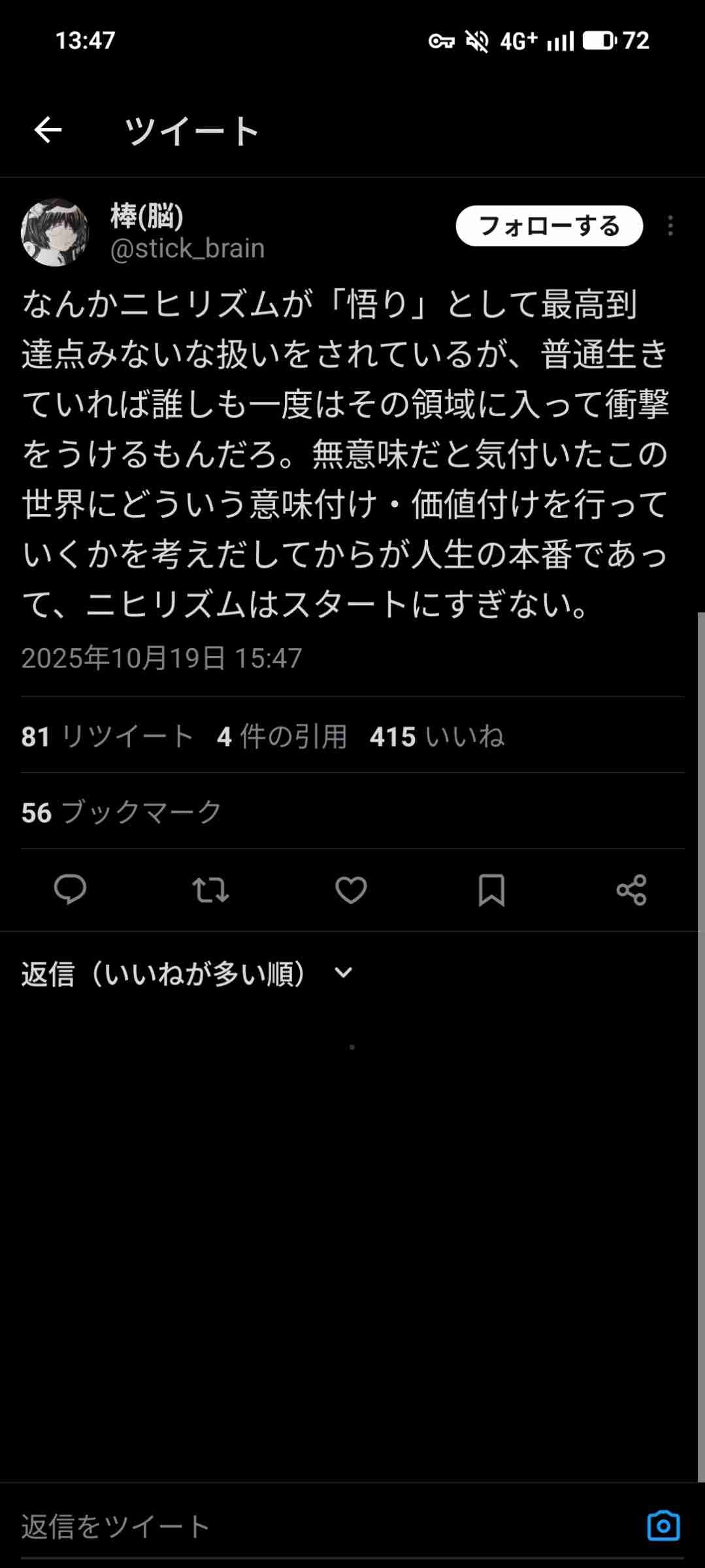 X民「なんかニヒリズムが「悟り」として最高到達点みないな扱いをされているが、"スタートライン"だよな」