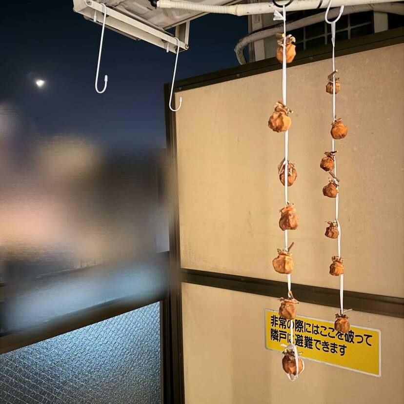 「大学生で一人暮らししてる息子の部屋に来ています 月が綺麗だからとベランダに出たら、干し柿 大学生男子のベランダに干し柿!」そんなコメントとともに投稿されたのは、1枚の写真でした。
