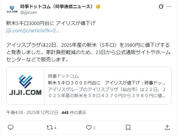 アイリスオーヤマ、2025年産の新米(5キロ)を3980円に値下げ、コメ問屋終わる