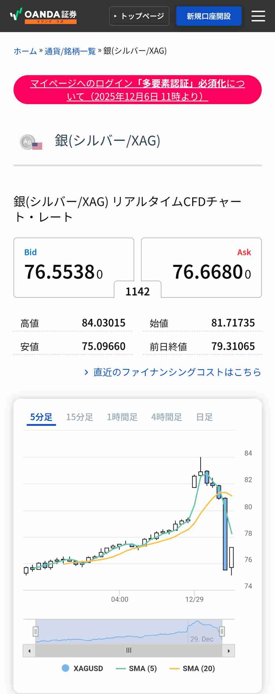 田中貴金属が1g430円というとんでもい金額に1オンス84ドルまで上がったのに一気に76ドルに暴落