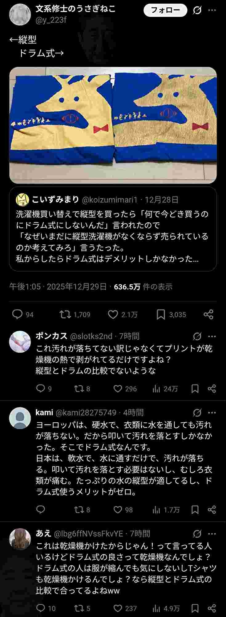 ハイエンドのドラムで汚れが落ちにくいなんてことはないしそもそも攪拌式より叩き洗いの方が生地が痛みにくいのにドラム式まともに使いない貧乏かつガラパゴスのジャップみてると先進国で唯一没落してる理由がわかる気がする