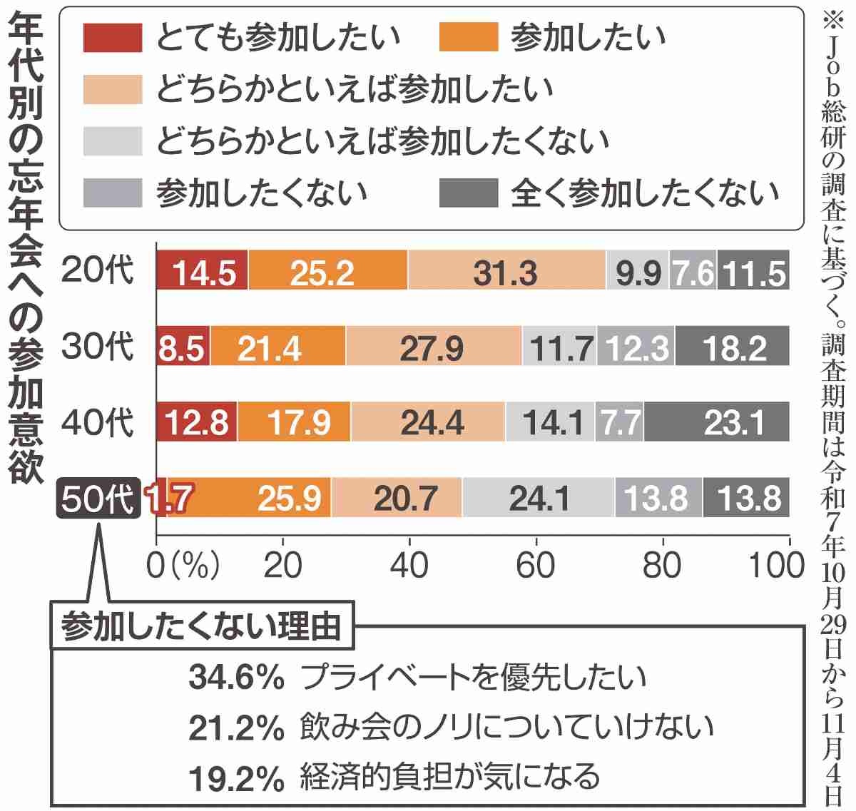 最も低かった50代では消極的になる理由として「プライベートを優先したい」(34・6%)に次いで、「飲み会のノリについていけない」(21・2%)を選んだ人が多かった。