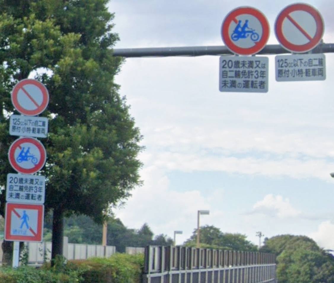「大型自動二輪車及び普通自動二輪車二人乗り通行禁止」という、レア度の高い道路標識もある。