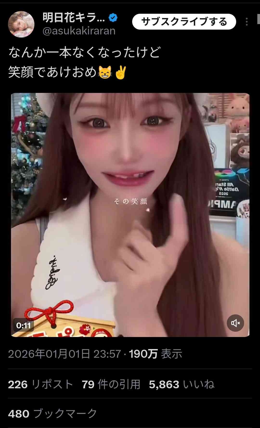 タレントでインフルエンサーの明日花キララが、1月1日、Xを更新。冒頭のコメントを添えて、前歯が1本ない状態の動画や写真を公開したことに、驚きと心配の声があがっている。