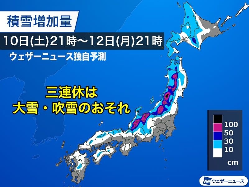 三連休は非常に強い寒気が南下 日本海側で大雪や猛吹雪のおそれ - ウェザーニュース明日10日(土)の夜から12日(月)にかけて強い寒気が南下する予想で、日本海側を中心に大雪や猛吹雪のおそれがあります。連休中の移動は、最新の交通情報や気象情報にお気をつけください。weathernews.jp
