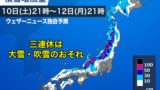 明日10日(土)の夜から12日(月)にかけて強い寒気が南下する予想で、日本海側を中心に大雪や猛吹雪のおそれがあります。