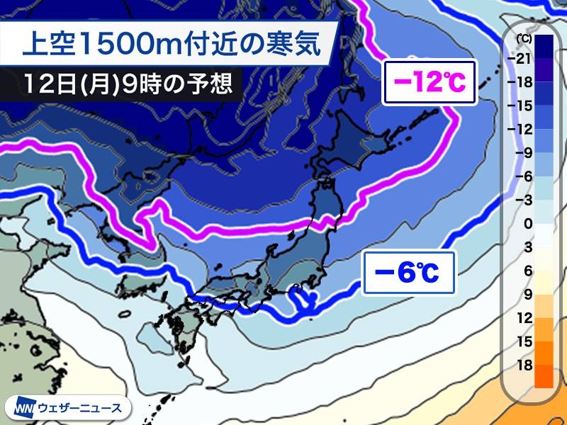 三連休中の明日10日(土)夜から12日(月)にかけて日本付近は冬型の気圧配置となり、上空に強い寒気が南下します。寒気の中心は上空約5,500mで−42℃くらいと非常に強く、この寒気が日本列島上空に南下する見込みです。また、平野部で雪を降らせる目安の上空約1,500mで−6℃以下の寒気が西日本や東日本を広く覆い、さらに強い−12℃以下の寒気が北日本を広く覆います。