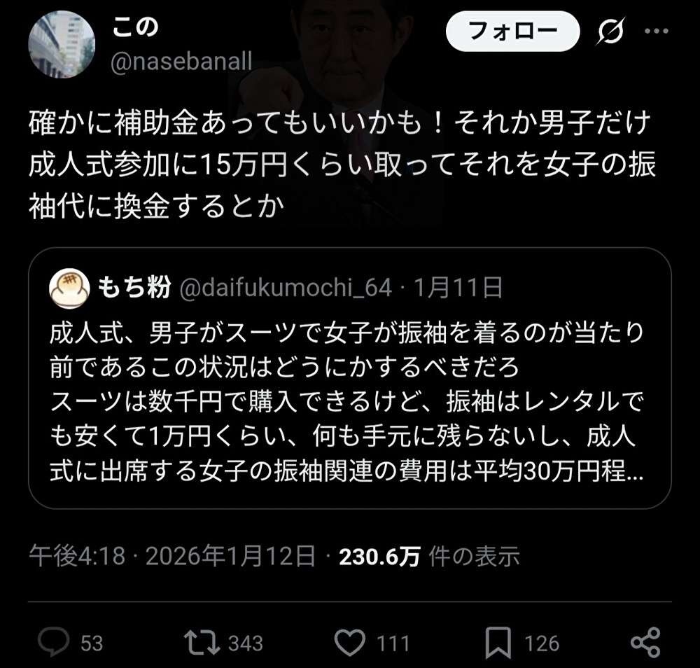 【正論】女子「成人式の服装にかかる費用男女で違うのおかしい!女子には補助金出すべき」