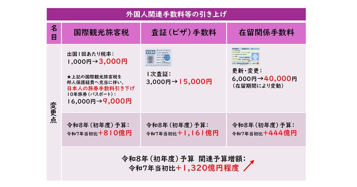 。近年オーバーツーリズムや不法滞在者による治安懸念といった外国人を巡るさまざまな社会問題が多発する中で、手数料引き上げに伴う財源確保で外国人問題対策への充実を図ります。国際観光旅客税では出国1回あたりの税率がこれまでは千円でしたが、3千円に変更。