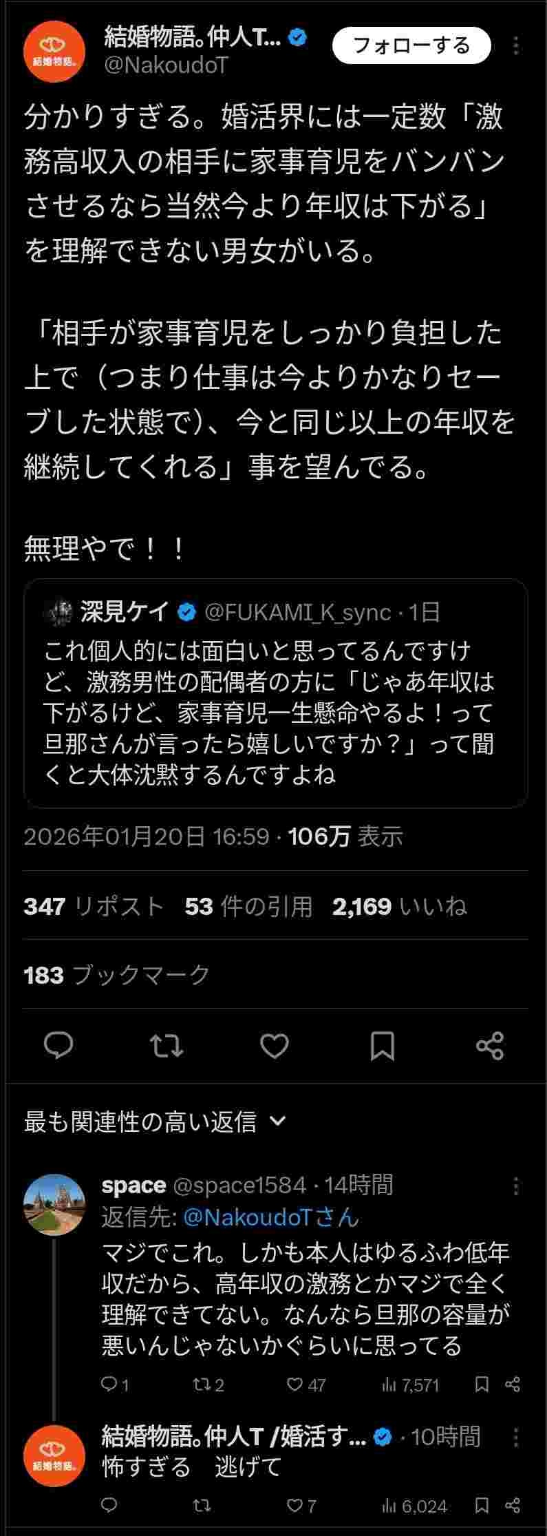 106.9万件の表示 結婚物語。仲人T /婚活するなら結婚物語。東京恵比寿と兵庫県高砂市にある結婚相談所 (@NakoudoT) on X分かりすぎる。婚活界には一定数「激務高収入の相手に家事育児をバンバンさせるなら当然今より年収は下がる」を理解できない男女がいる。 「相手が家事育児をしっかり負担した上で(つまり仕事は今よりかなりセーブした状態で)、今と同じ以上の年収を継続してくれる」事を望んでる。 無理やで!!x.com