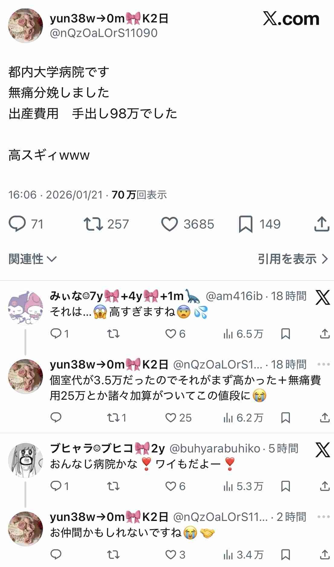 麻酔医さえ足りてれば欧米式の計画無痛&翌日帰宅の方が安あがりだったりするんかね