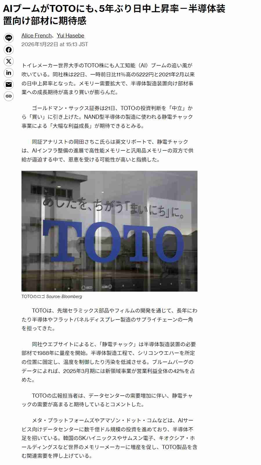 トイレのTOTOまでAI関連銘柄に、5年ぶり日中上昇率