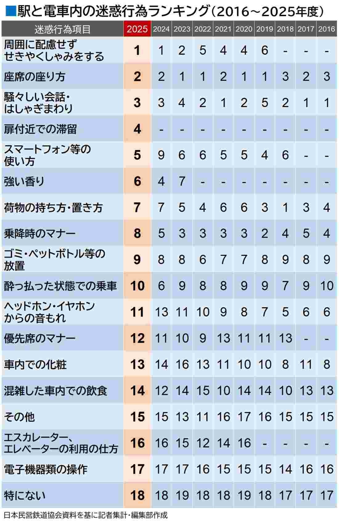 あなたが電車内で迷惑だと感じる「あの行為」は何位?駅と車内の「迷惑行為ランキング」2025年度版 乗り降りの邪魔「ドア地蔵」、電車迷惑度の上位に(東洋経済オンライン) – Yahoo!ニュース