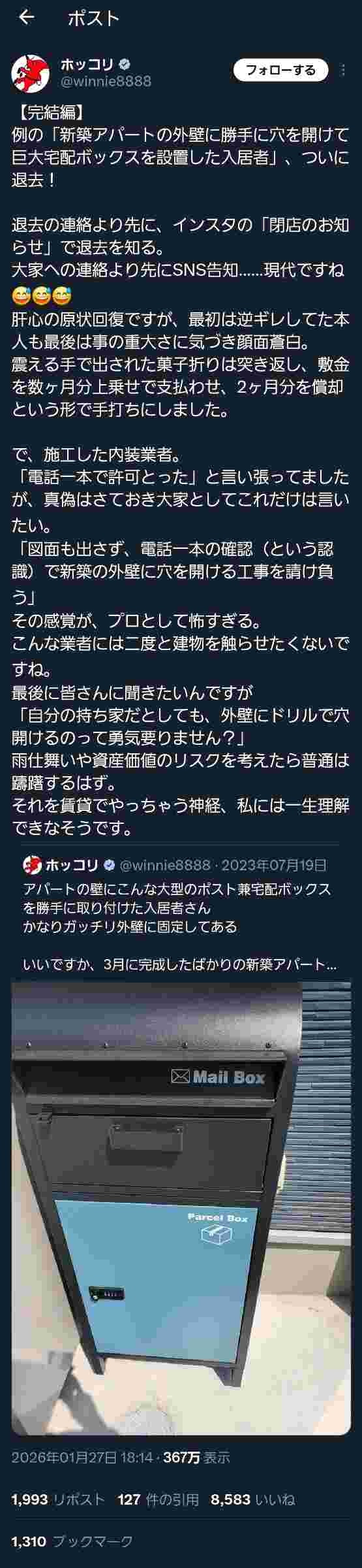 宅配ボックスまではわかるが、なんでそんな壁に穴開けてまで固定しようとしたんだ?