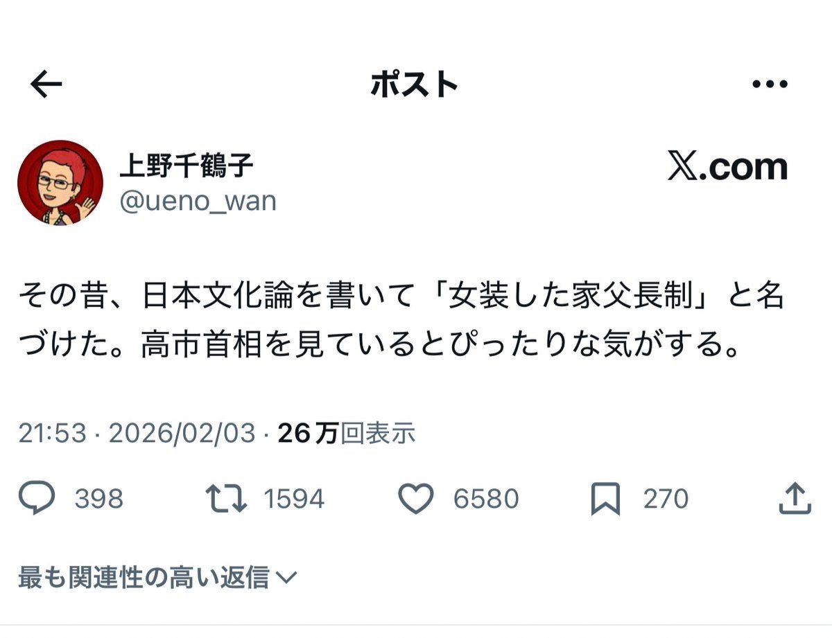 上野千鶴子、高市総理のことを「女装した家父長制」と言い出した。女性の活躍を邪魔してるのはフェミニスト達だろ。